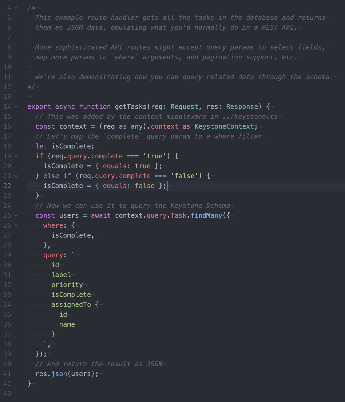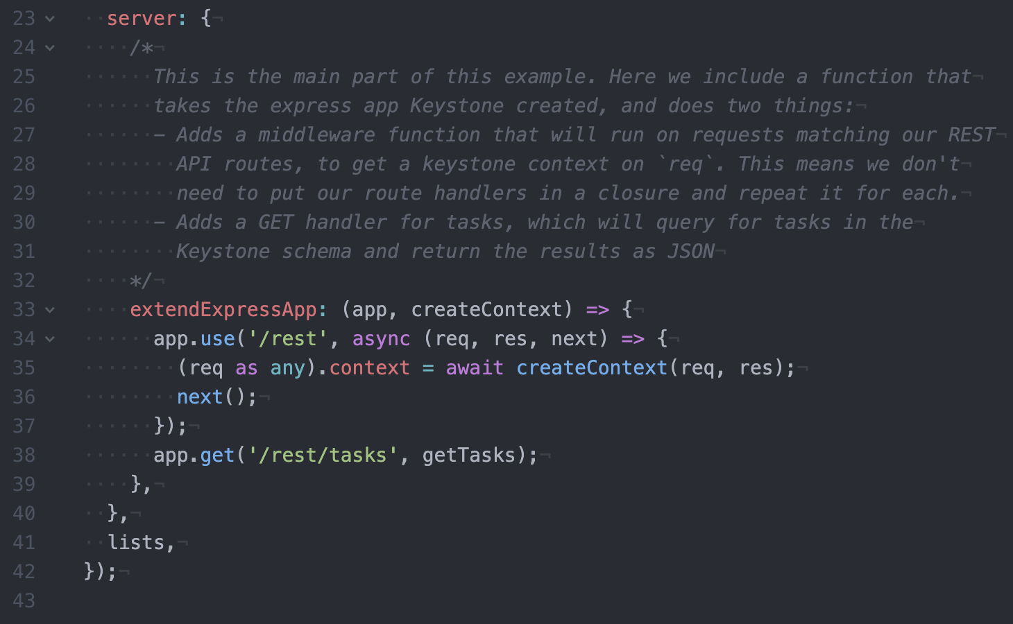 In a new example we demonstate how to create REST endpoints by extending Keystone's express app and using the Query API to execute queries against the schema.